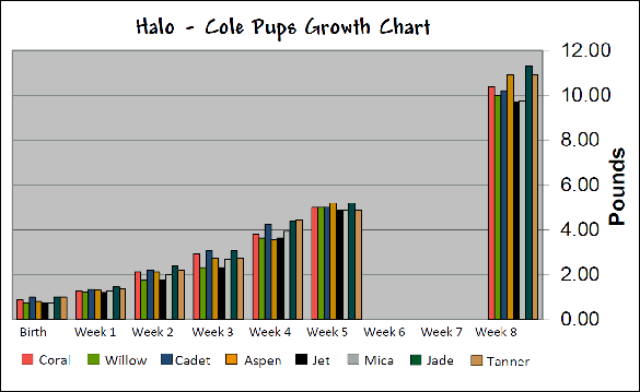| We apologize that we missed the weigh-ins for Weeks 6 and 7 and the Week 7 Update. We lost little Sky from the Brie-Red litter at 4 weeks. |